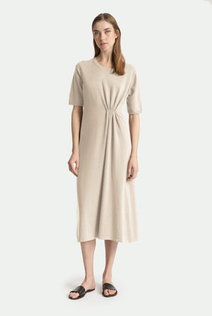 Regular fit cashmere dress with a discreet gathered detail on one side, which enhances its lines. The soft fabric and sleek construction ensure comfort and a natural drape for a versatile and contemporary garment.