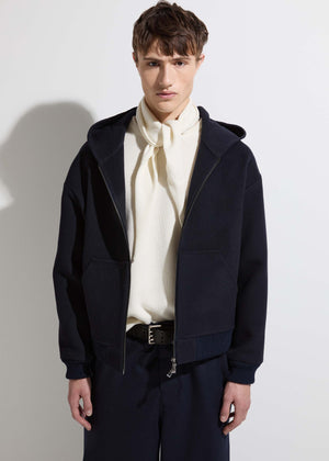 Hooded bomber jacket made of compact virgin wool and cashmere cloth, which is steamed for a more puffy and voluminous effect. The knitted details on the sleeves and collar add comfort and style, while the sleeve lining ensures warmth and practicality. A warm and versatile bomber jacket, ideal for facing cool days in contemporary style.
