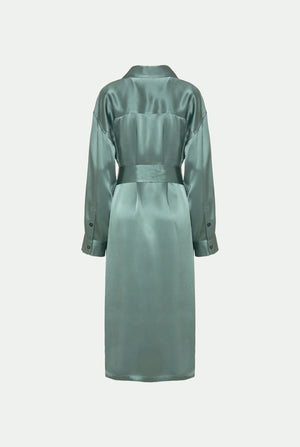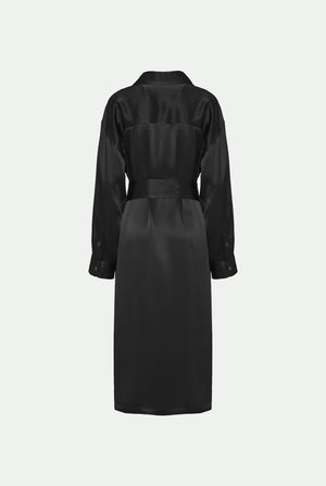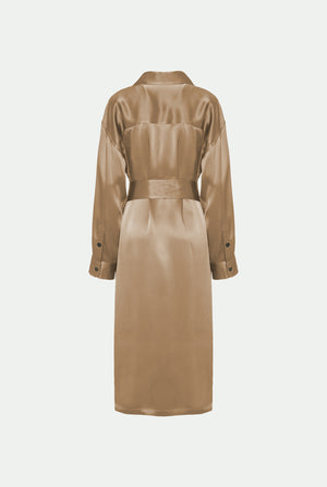 This satin and viscose shirt dress combines softness and shine in a garment with a sophisticated personality. The rounded hemline is inspired by men's style; the slits in the cuffs complete the design, offering practicality and a touch of timeless elegance. The buttons are made of Beigee horn.