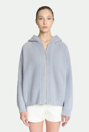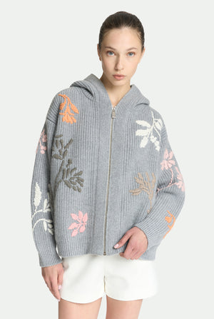 Hooded cashmere bomber jacket with floral hand embroidery. Soft and snug, this zipped bomber jacket in pure cashmere combines the comfort of casual style with sophisticated craftsmanship. The hooded design is embellished with delicate hand-embroidered floral motifs, which add a discreet, feminine touch. A versatile garment, ideal for elevating your everyday wardrobe with a touch of elegance.