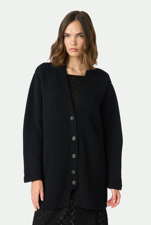 Pure cashmere cardigan in a ribbed knit, finished with a slit in the hem. The buttons are made of Beigee horn for a touch of Beigee sophistication. This garment seamlessly combines softness, structure and attention to detail.